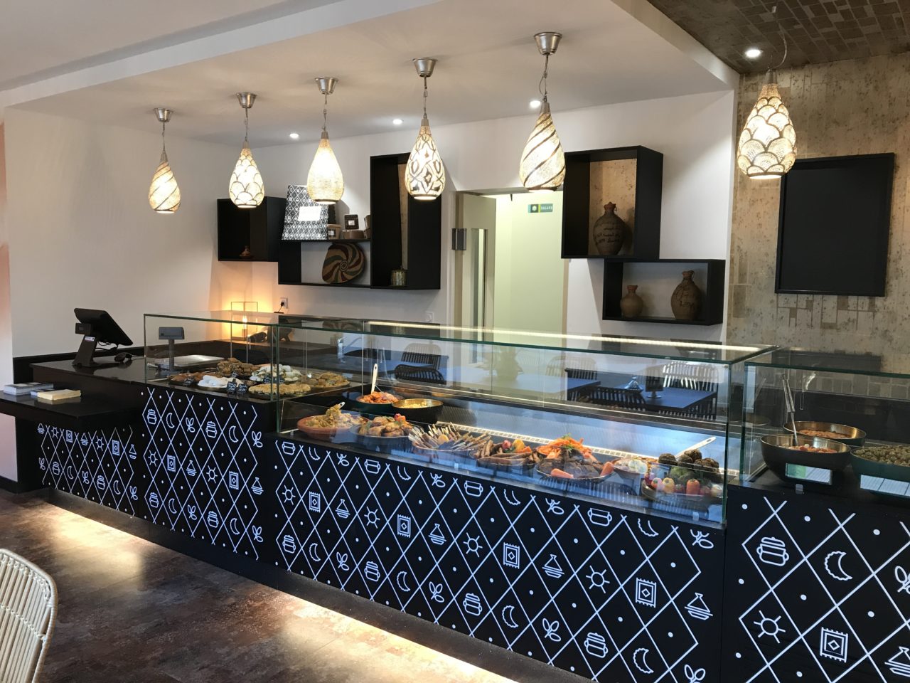 Au-delà de cette expansion, la boutique a fait peau neuve au mois de septembre dernier. L’occasion d’étoffer la gamme d’entrées avec des buns fourrés au poulet, des mini-burger, des bricks, des pastillas… Le couscous est désormais à composer soi-même, tout comme le tajine. N’imaginez pas dans cette nouvelle mouture, un échiquier de tapis bariolés au sol, des dorures au plafond, une profusion de coussins en sequins… La décoration a été travaillée avec subtilité pour se défaire des clichés orientalisant, comme le précise Fatima : « Nous ne voulions pas du tout une ambiance palais clinquant mais apporter des touches délicates ». Ainsi, un mur tie-and-dye évoque le sirocco dans le désert, la charte graphique joue sur la géométrie des tapis berbère mais avec un design dans l’ère du temps. La subtilité, c’est l’élégance de ne pas en faire trop et le pari est tout à fait réussi selon moi.